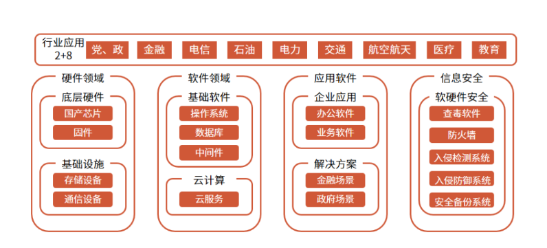 信创,即信息技术应用创新产业,是数据安全、网络安全的基础,也是新基建的重要组成部分。信创产业庞大,涉及基础硬件(芯片、服务器等)、基础软件(操作系统、数据库、中间件等)、应用软件(OA、ERP、办公软件等)、信息安全(边界安全产品、终端安全产品等)4个部分,其中芯片、整机、操作系统、数据库、中间件是更为重要的产业链环节。