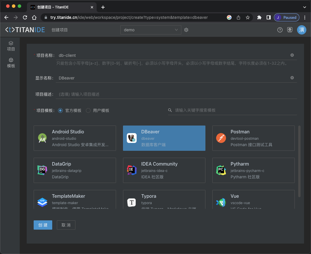 在 TitanIDE 启动 DBeaver 非常简单,选择 DBeaver 模板创建一个项目即可。(在 PC机用过本地版本的朋友一定知道,您在正式使用 DBeaver 的时候需要安装 JDK,然后在连接数据库的时候需要等待安装驱动,在 TitanIDE 将这些步骤都做成模板后,已经简化很多了,和其他 IDE、工具的使用方式一样开箱即用。)