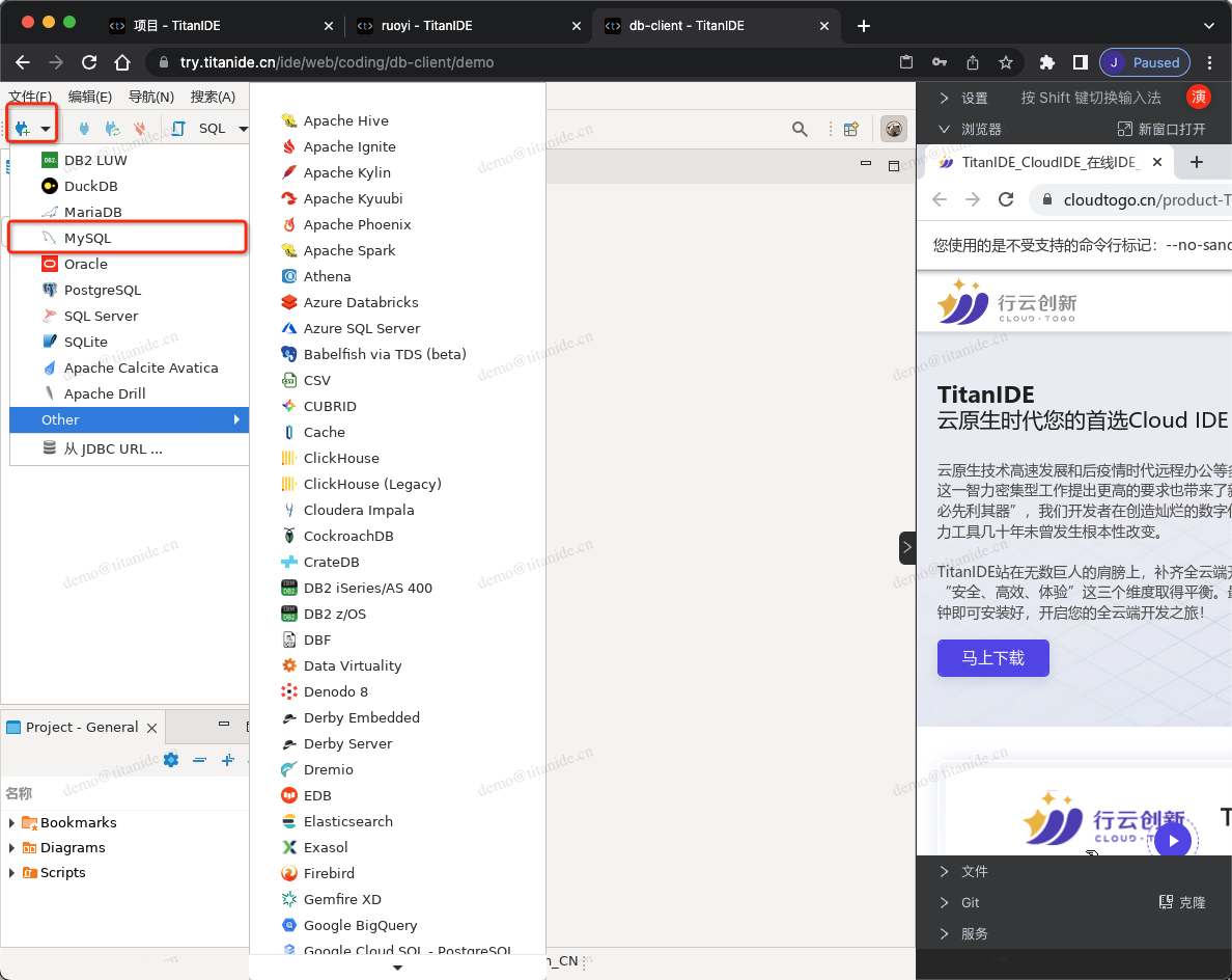 最近,我在使用 TitanIDE 开发云原生应用的时候,需要一个客户端操作数据库,我们一般都会在自己的电脑安装 NaviCat、Workbench、DBeaver 等数据库客户端工具。这些工具都挺好用的。不过呢,NaviCat 想说爱你不容易,虽然MySQL Workbench 是免费的,但是仅支持 MySQL。最后找到了 DBeaver,发现 DBeaver 通过 JDBC 连接到数据库,可以支持几乎所有的数据库产品,还开源、免费。但问题是,TitanIDE 是运行在云端,通过浏览器来访问的,而以上工具皆运行在本地桌面操作系统内部,一个在云端,一个在本地,TitanIDE 和 DBeaver 是怎么坠入爱河的呢?且听我娓娓道来......