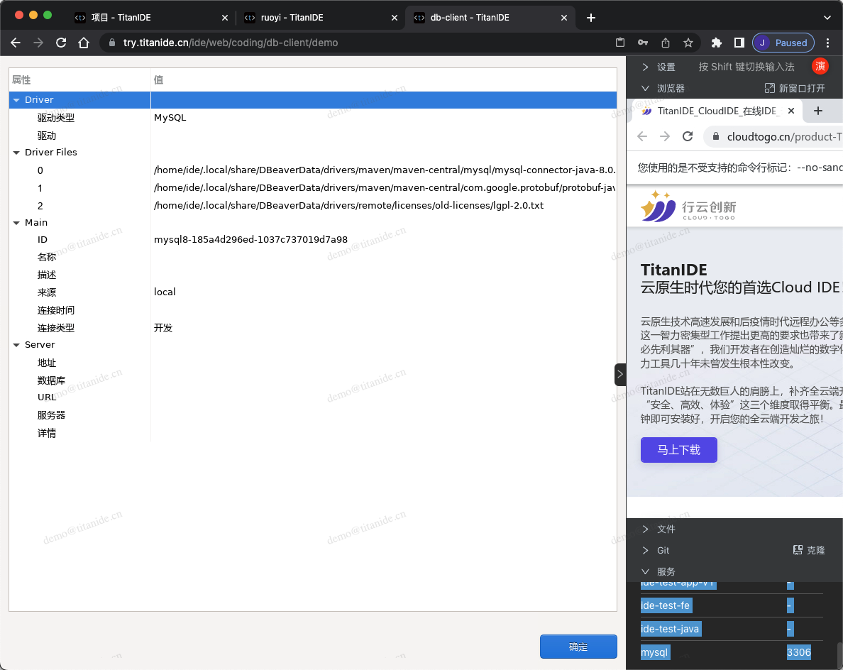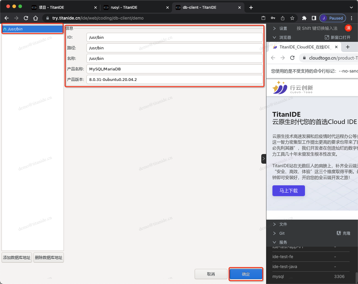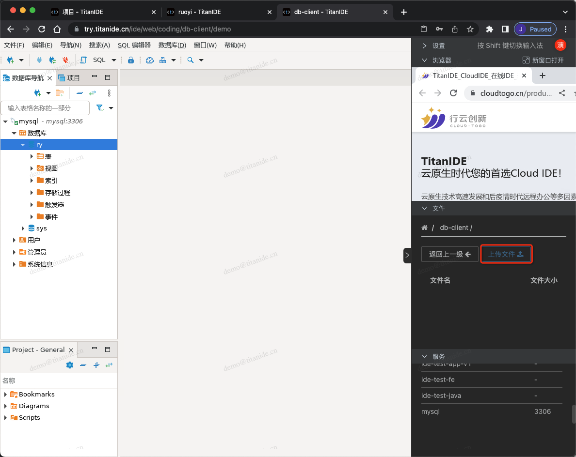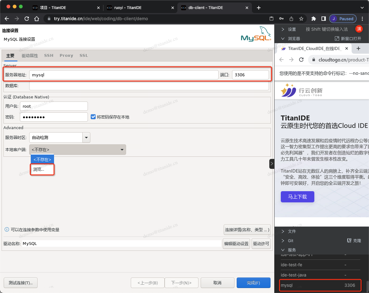 在创建新的数据库连接时,以下标红色部分需要注意,服务器地址填写 mysql是因为 MySQL部署在 DBeaver 同一个开发空间 demo,在右下角的服务列表有提示服务名称和端口号,点击服务名称即可复制并粘贴到服务器地址栏,认证填写连接数据库的用户名和密码,在 Advanced 区域,有个本地客户端,需要指定本地客户端所在的目录,为什么需要配置这么一个客户端呢,因为在导入数据的时候需要用到。在上面有提到,TitanIDE 在 /usr/bin 项目默认安装了 mysql的命令行客户端,如果是其他的本地客户端,仍然可以通过右侧栏的文件上传工具上传到 DBeaver 的工作区,然后在本地客户端下拉浏览找到您上传的客户端。