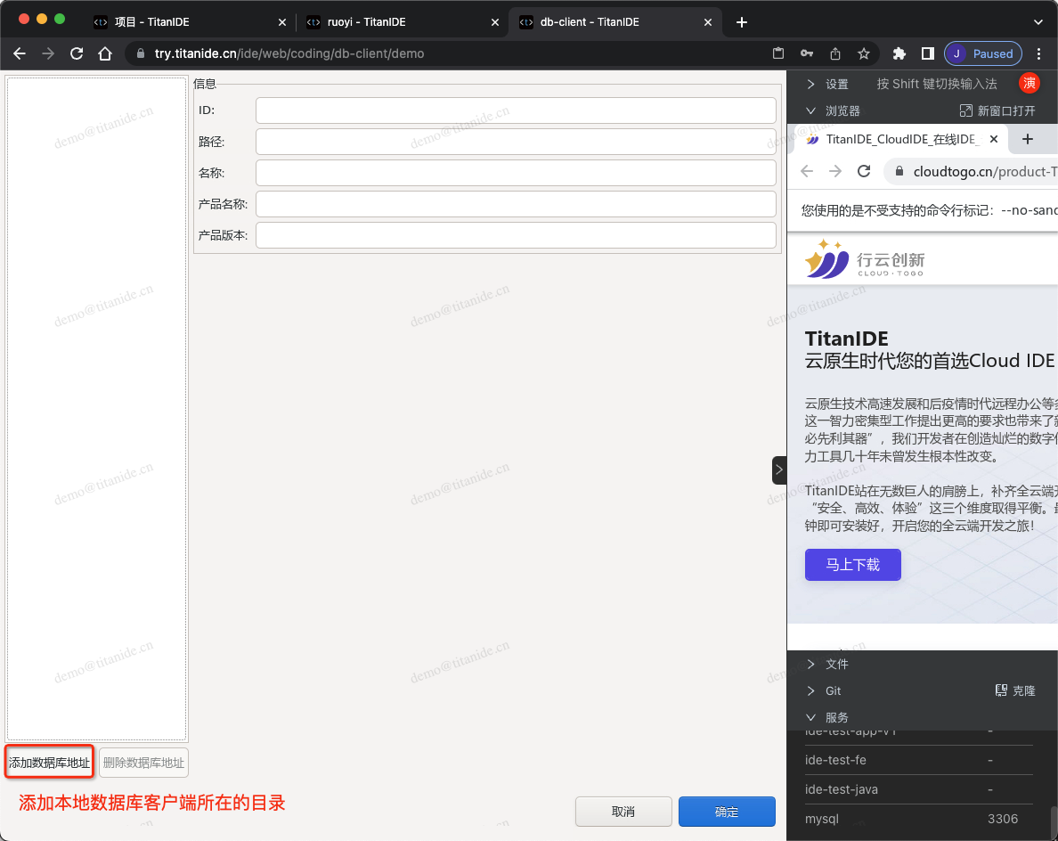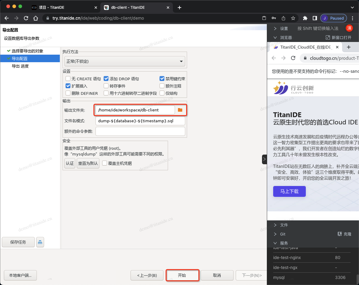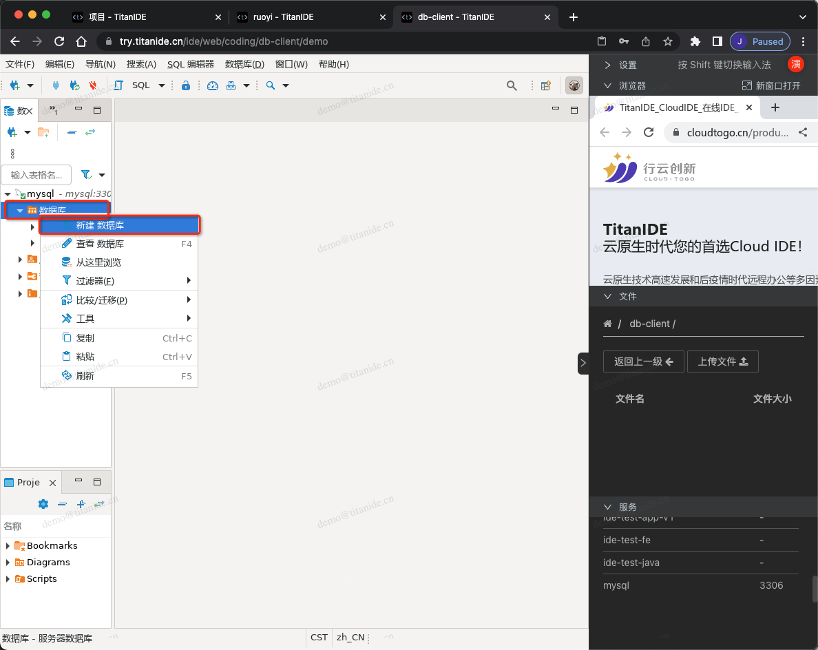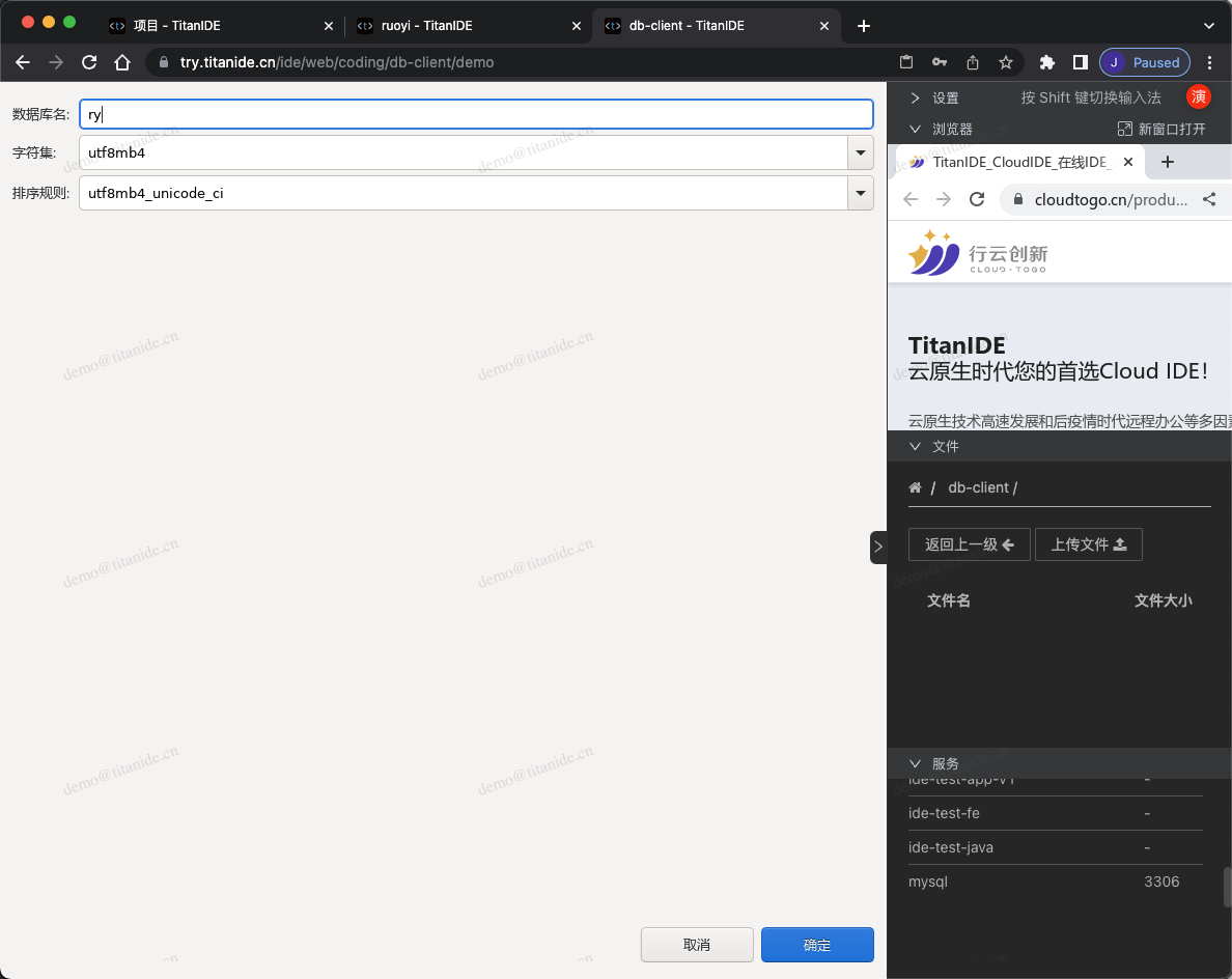 在创建新的数据库连接时,以下标红色部分需要注意,服务器地址填写 mysql是因为 MySQL部署在 DBeaver 同一个开发空间 demo,在右下角的服务列表有提示服务名称和端口号,点击服务名称即可复制并粘贴到服务器地址栏,认证填写连接数据库的用户名和密码,在 Advanced 区域,有个本地客户端,需要指定本地客户端所在的目录,为什么需要配置这么一个客户端呢,因为在导入数据的时候需要用到。在上面有提到,TitanIDE 在 /usr/bin 项目默认安装了 mysql的命令行客户端,如果是其他的本地客户端,仍然可以通过右侧栏的文件上传工具上传到 DBeaver 的工作区,然后在本地客户端下拉浏览找到您上传的客户端。