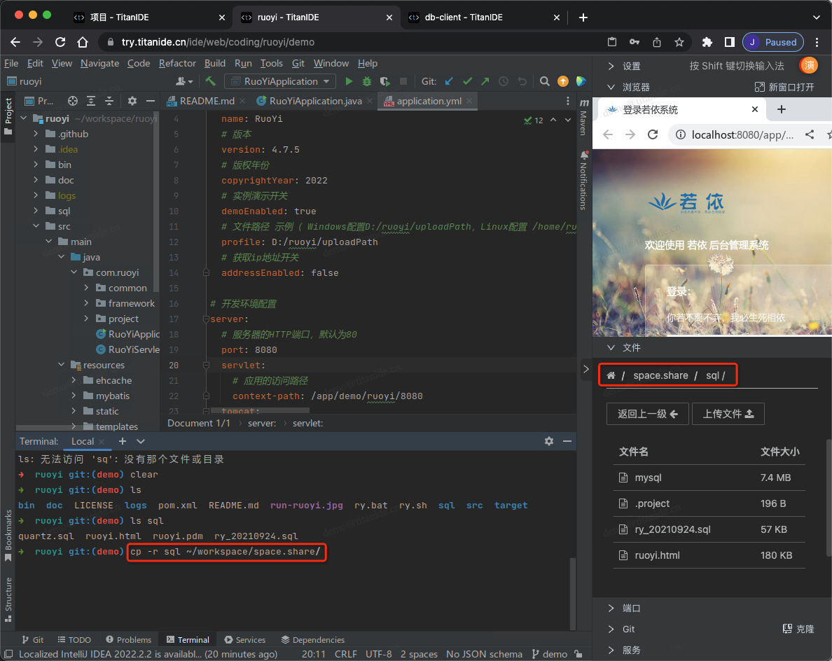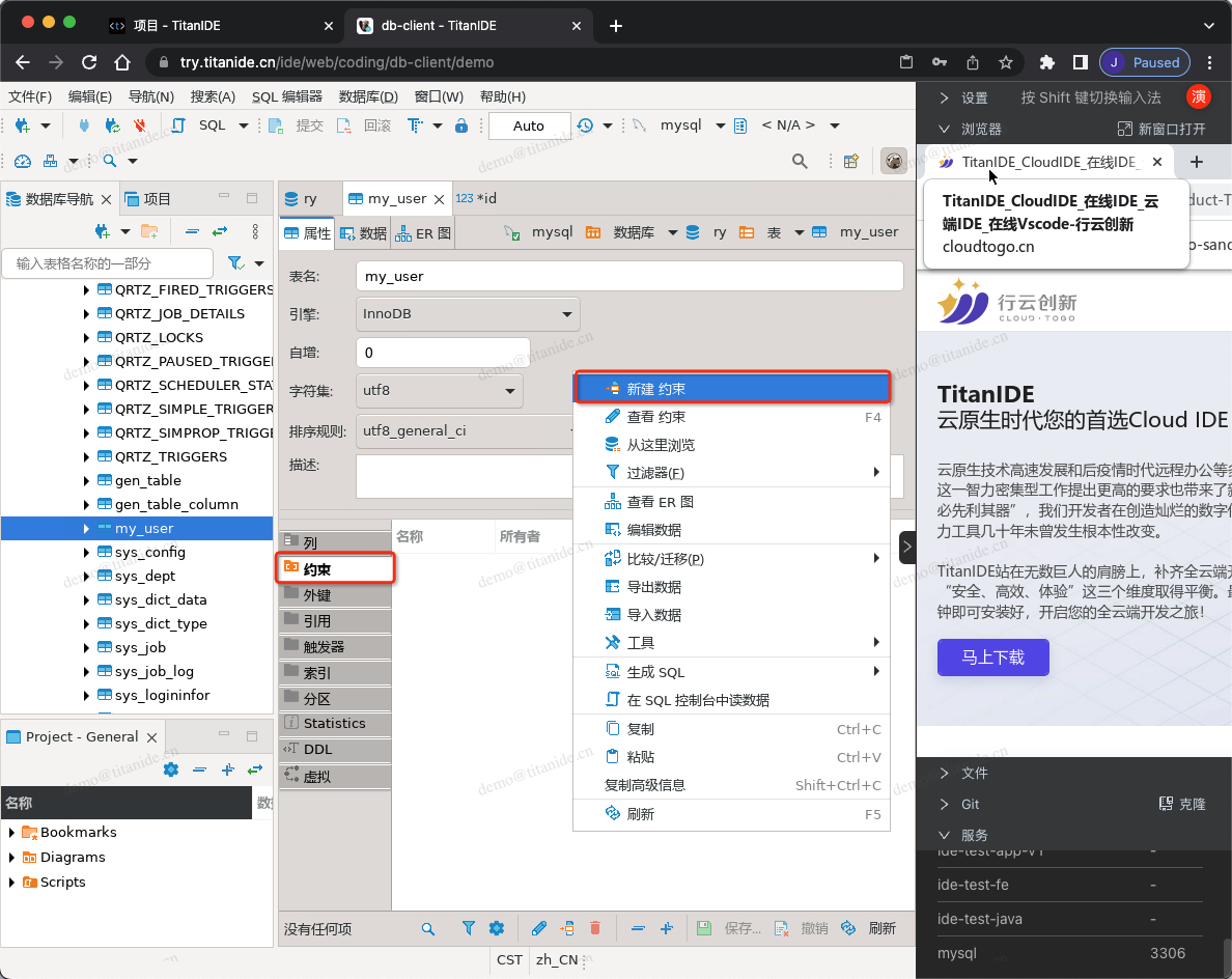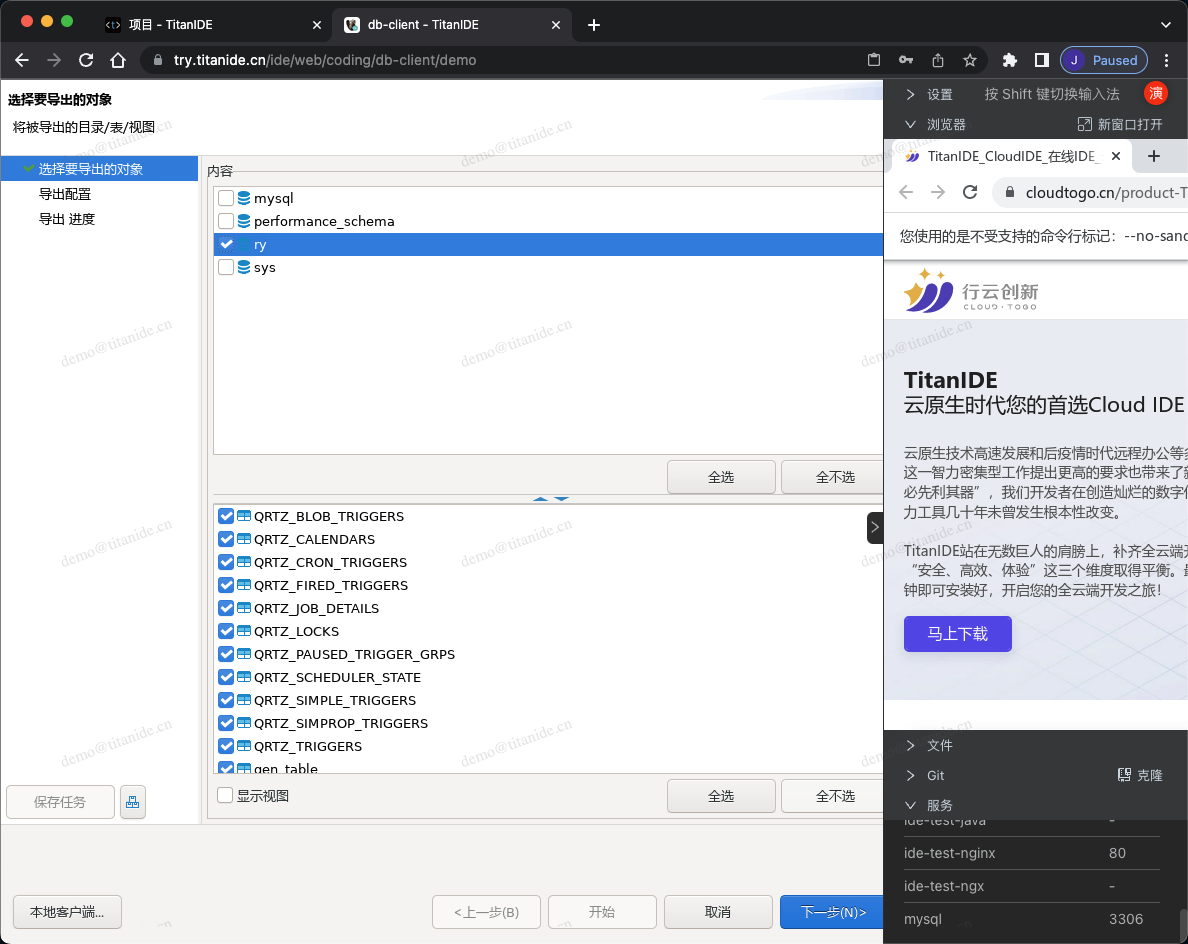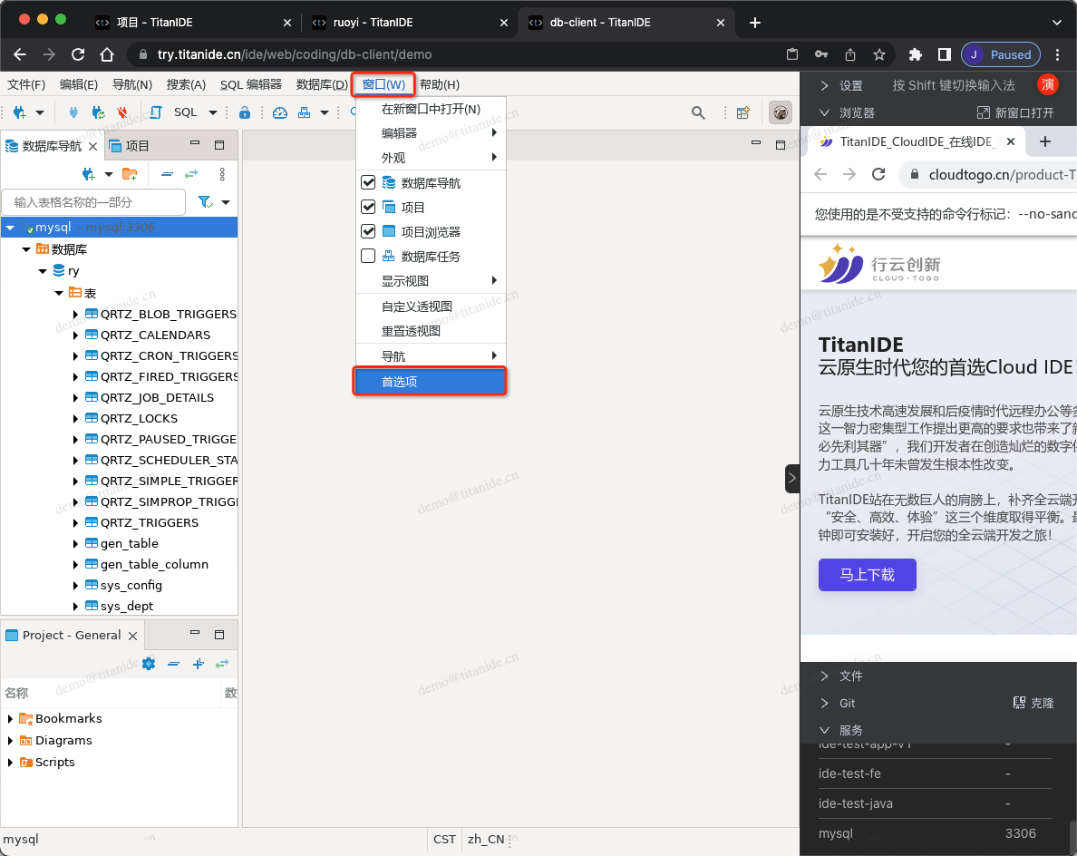 在创建新的数据库连接时,以下标红色部分需要注意,服务器地址填写 mysql是因为 MySQL部署在 DBeaver 同一个开发空间 demo,在右下角的服务列表有提示服务名称和端口号,点击服务名称即可复制并粘贴到服务器地址栏,认证填写连接数据库的用户名和密码,在 Advanced 区域,有个本地客户端,需要指定本地客户端所在的目录,为什么需要配置这么一个客户端呢,因为在导入数据的时候需要用到。在上面有提到,TitanIDE 在 /usr/bin 项目默认安装了 mysql的命令行客户端,如果是其他的本地客户端,仍然可以通过右侧栏的文件上传工具上传到 DBeaver 的工作区,然后在本地客户端下拉浏览找到您上传的客户端。