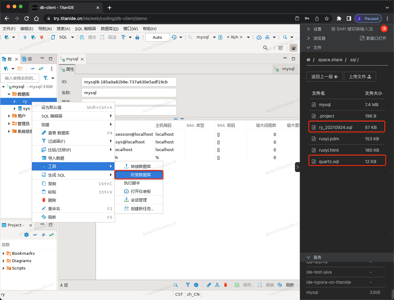 方式三:如果您是在 TitanIDE 上已经克隆了代码到同一个开发空间的其它项目,则可以通过一个 space.share 的文件来共享SQL脚本,在随后恢复数据库的时候选择 space.share 的SQL脚本文件: